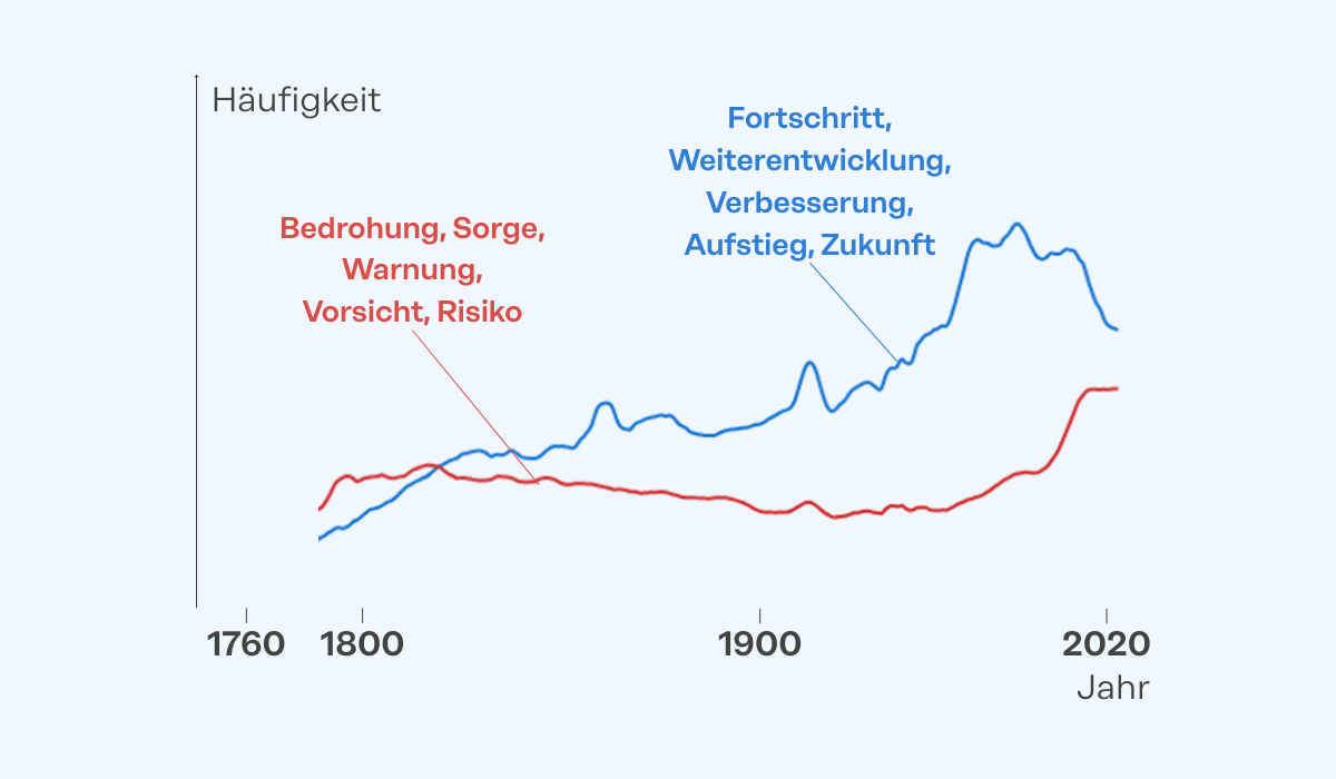 Die Theorie klingt einleuchtend, doch kann sie auch belegt werden? Vier Ökonomen haben 173 301 in England zwischen 1500 und 1900 gedruckte Bücher ausgewertet: Ab dem 17. Jahrhundert kamen in wissenschaftlichen Texten vermehrt fortschrittsorientierte Begriffe vor. Die Kultur des Wachstums etablierte sich. Wenn man eine ähnliche Analyse auf unsere Zeit anwendet, zeigt sich eine Kultur der Sorge. So zeigen Daten des Google-Ngram-Projekts, das auf Millionen digitalisierter Bücher seit dem Jahr 1500 beruht, dass in deutschsprachigen Büchern die Häufigkeit von Begriffen wie Fortschritt und Zukunft seit Mitte der 1980er Jahre stark abnimmt, die Nennung von Bedrohung, Sorgen und Risiko nimmt hingegen zu. Der Sorgen-Trend gilt auch bei englischsprachigen Büchern, ab Mitte der 1990er Jahr legt bei diesen jedoch die Häufigkeit von Fortschritts- und Zukunftsbegriffen wieder zu. Technologieskepsis und Bedenkenträgerei sind nicht nur in deutschsprachigen Ländern vorhanden, dafür aber ausgeprägt. Wachstum beginnt eben auch in den Köpfen.