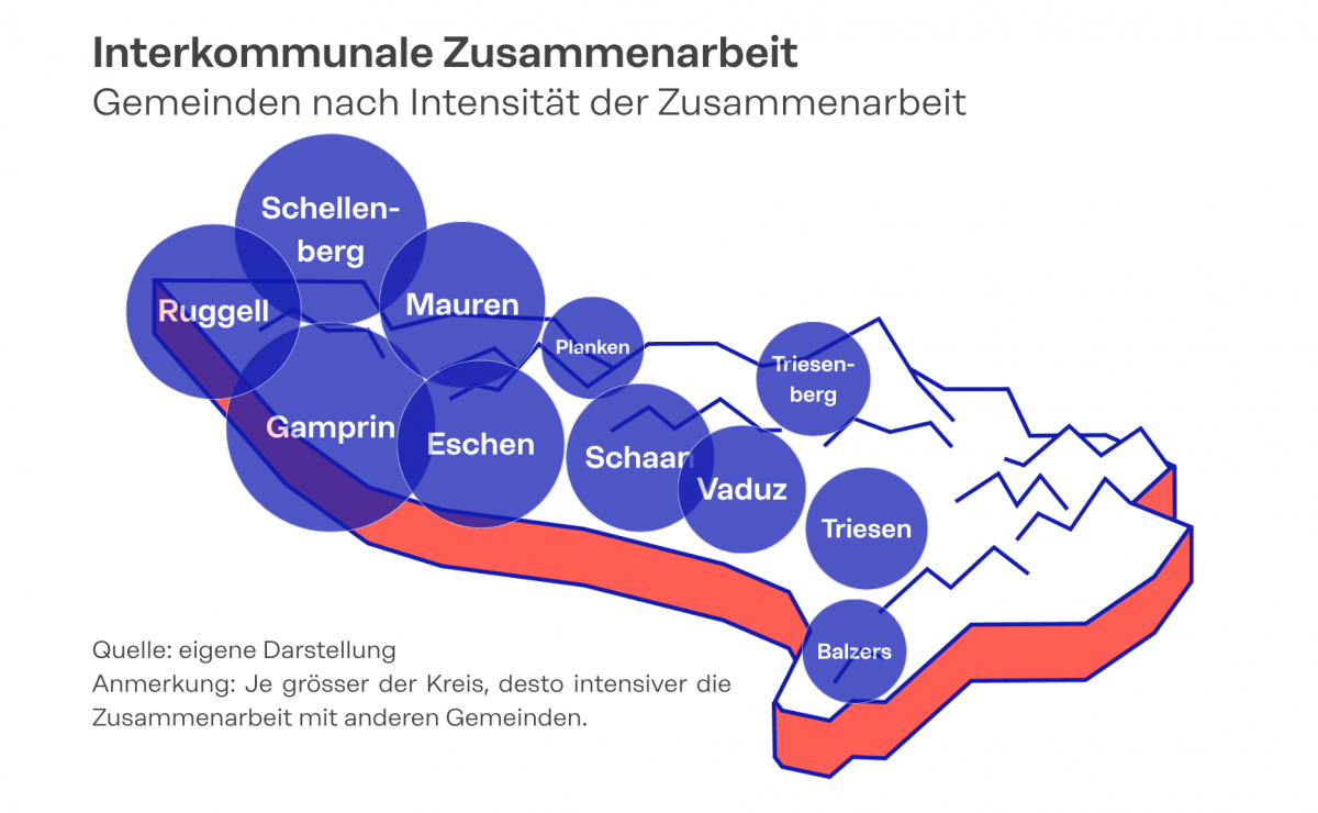 Besonders häufig finden sich Kooperationen mit drei Gemeinden oder auch grosse Zusammenschlüsse aller elf Gemeinden. Beispiele für 11er-Konstellationen sind der Entsorgungszweckverband, Streetwork Liechtenstein oder das IT-Zusammenarbeitsprojekt «DIDI». Jüngere IKZ-Modelle sind die Zusammenarbeit zwischen Balzers, Triesen und Triesenberg bei den gemeindepolizeilichen Aufgaben oder die gemeinsame Sportkoordination für Ruggell, Gamprin und Schellenberg.