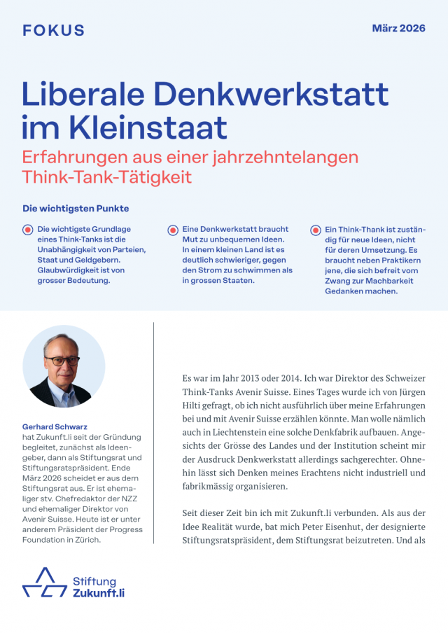 Gerhard Schwarz hat Zukunft.li seit der Gründung begleitet, zunächst als Ideengeber, dann als Stiftungsrat und Stiftungsratspräsident. Ende März 2026 scheidet er aus dem Stiftungsrat aus. Er ist ehemaliger stv. Chefredaktor der NZZ und ehemaliger Direktor von Avenir Suisse. Heute ist er unter anderem Präsident der Progress Foundation in Zürich.