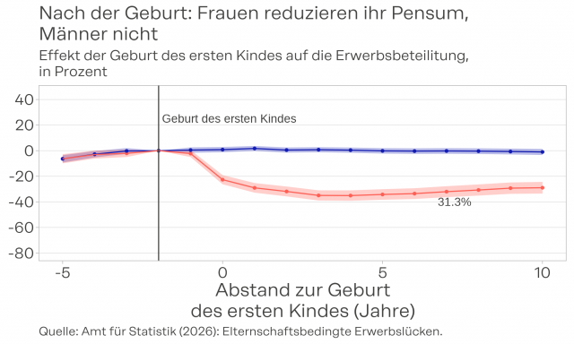 Wertvolle Fachkräfte gehen dem Arbeitsmarkt verloren, wenn Frauen, die gut ausgebildet sind, nicht oder nur in geringem Pensum erwerbstätig sind. Häufig reduzieren Frauen ihre Erwerbstätigkeit nach der Geburt des ersten Kindes. Dreimal so häufig wie Männer, wie eine Publikation vom Amt für Statistik* zeigt.